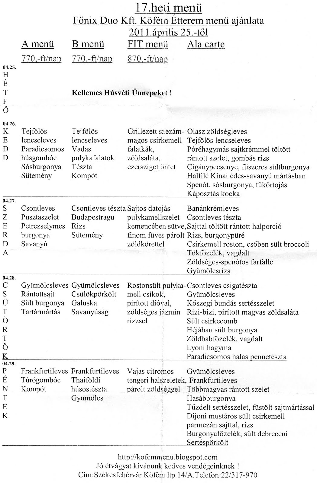 Köfém Étterem 17. heti menü, a’la carte ajánlata